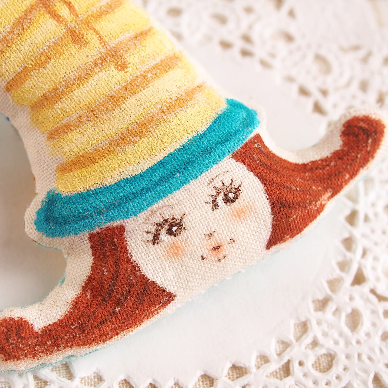 白、またはキナリの布を手縫いし、綿を入れて人形の形を作り、そこへ直接アクリル絵の具で着色しています。