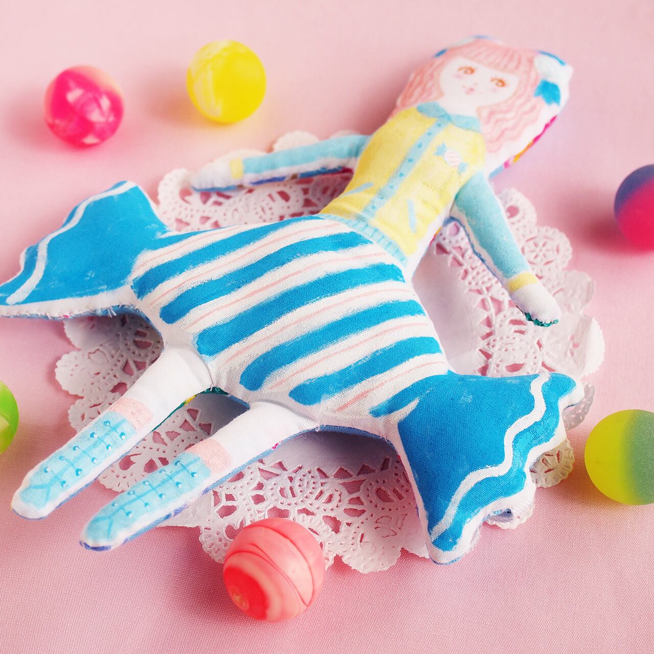 白、またはキナリの布を手縫いし、綿を入れて人形の形を作り、そこへ直接アクリル絵の具で着色しています。