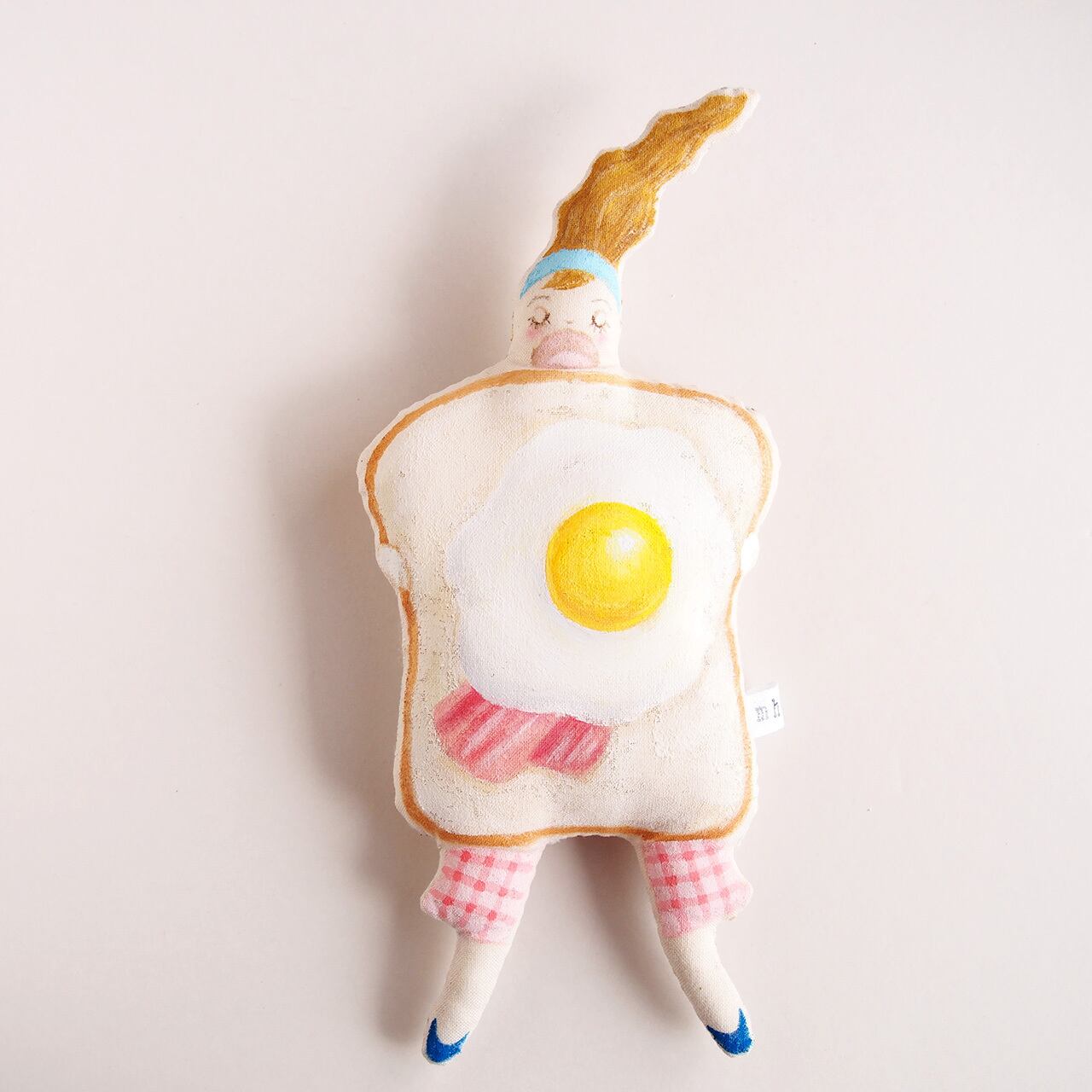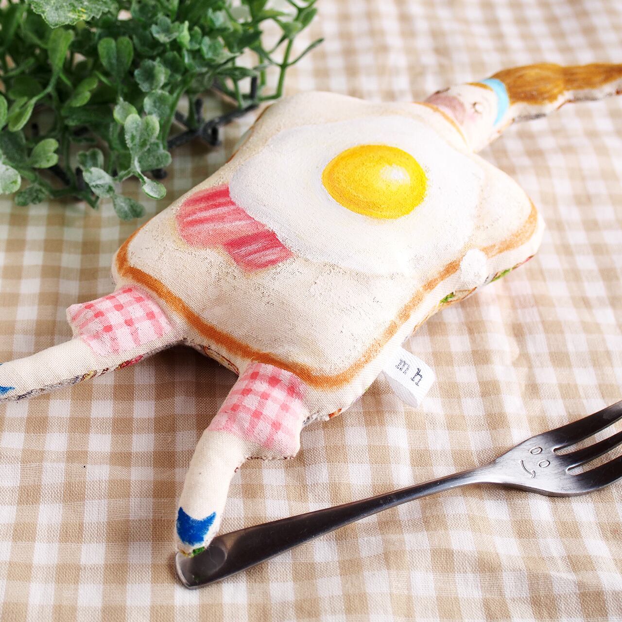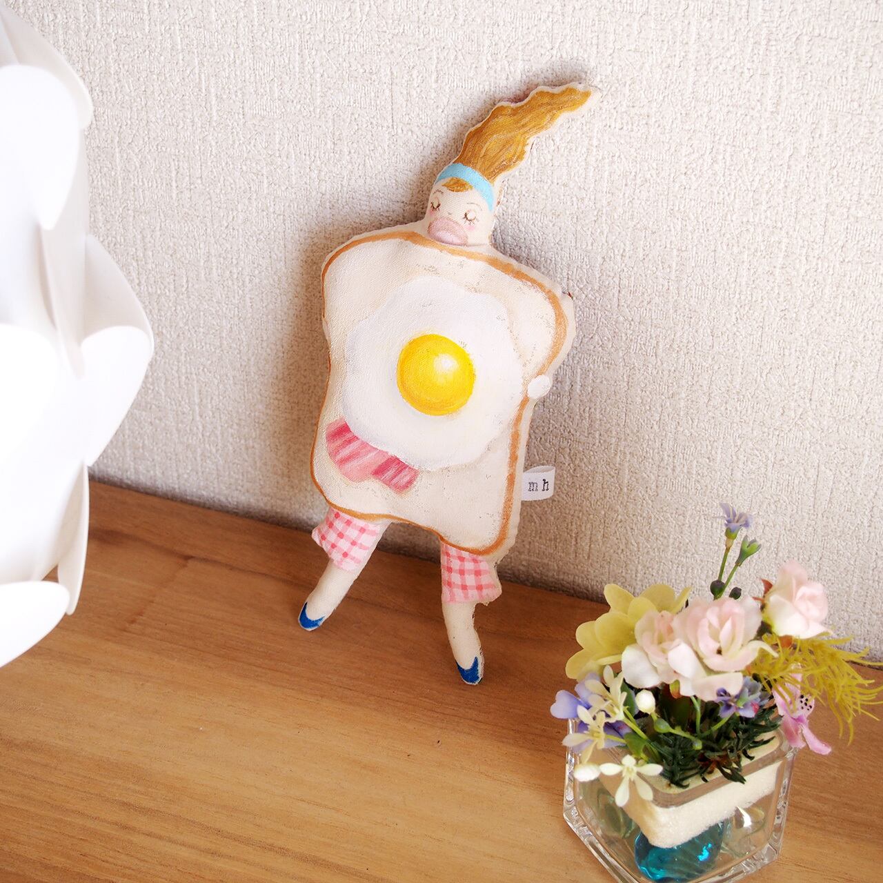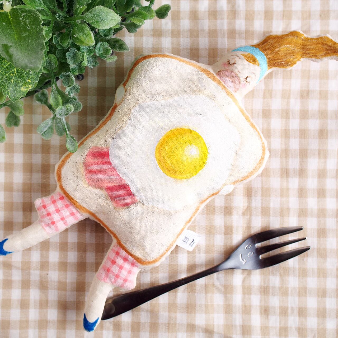 ベーコンエッグが乗った、デカすぎる食パンをかじる女の子。