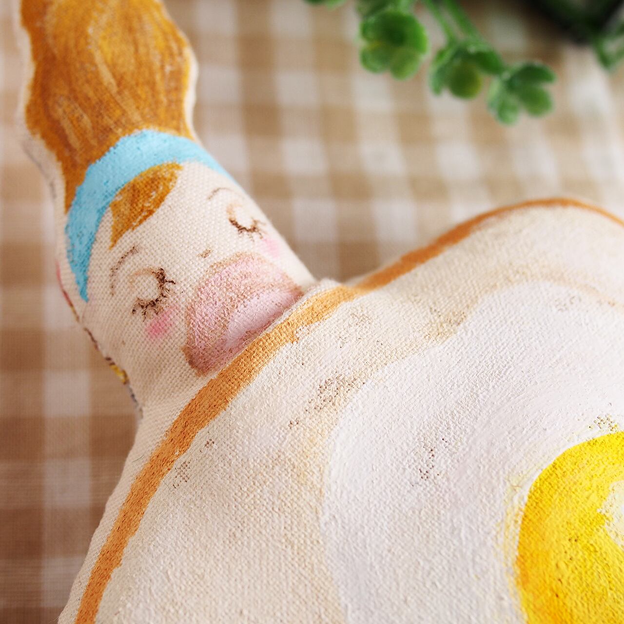 白、またはキナリの布を手縫いし、綿を入れて人形の形を作り、そこへ直接アクリル絵の具で着色しています。