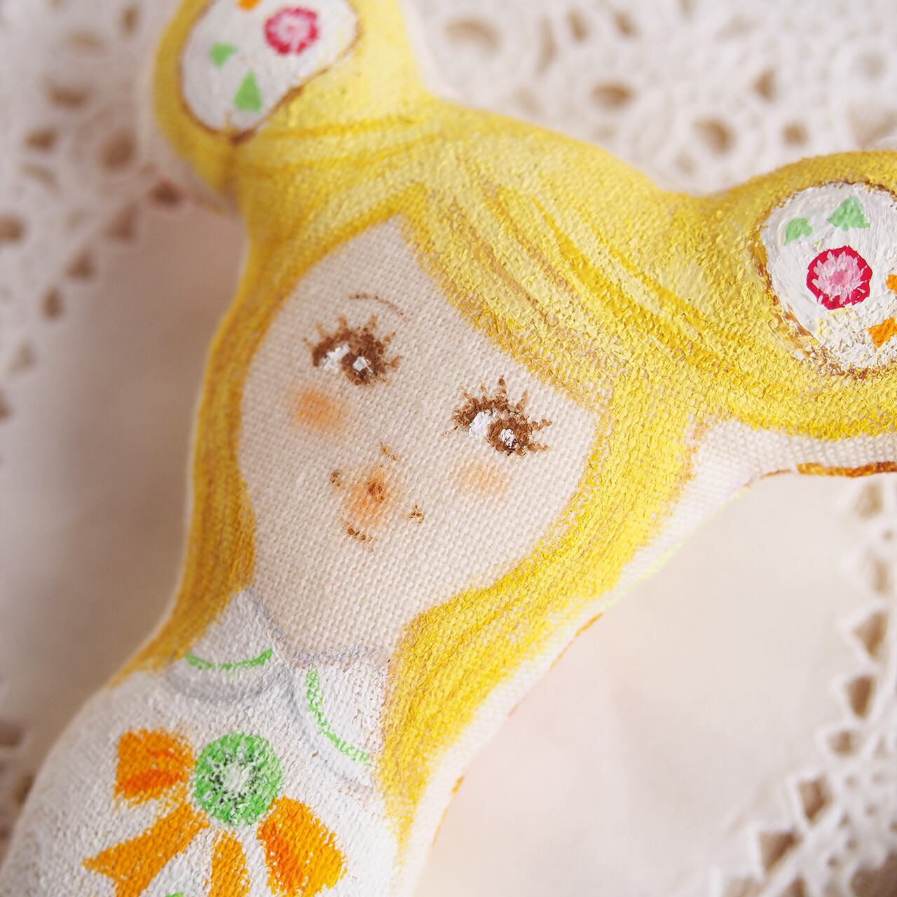 白、またはキナリの布を手縫いし、綿を入れて人形の形を作り、そこへ直接アクリル絵の具で着色しています。