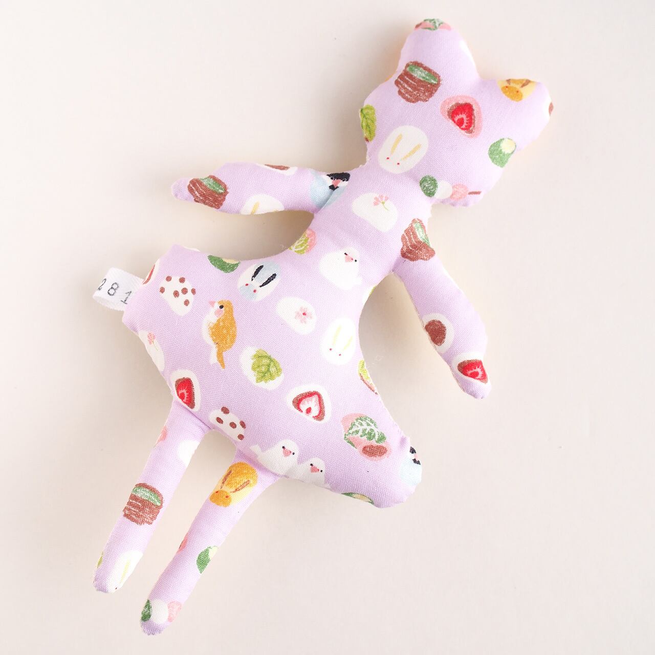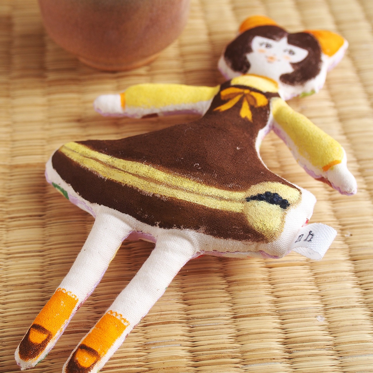 白、またはキナリの布を手縫いし、綿を入れて人形の形を作り、そこへ直接アクリル絵の具で着色しています。