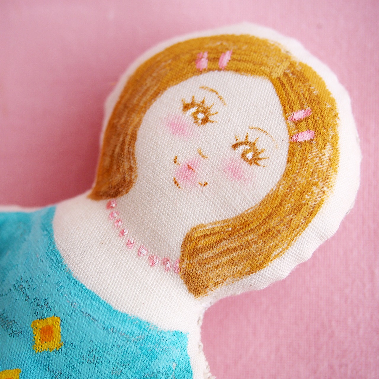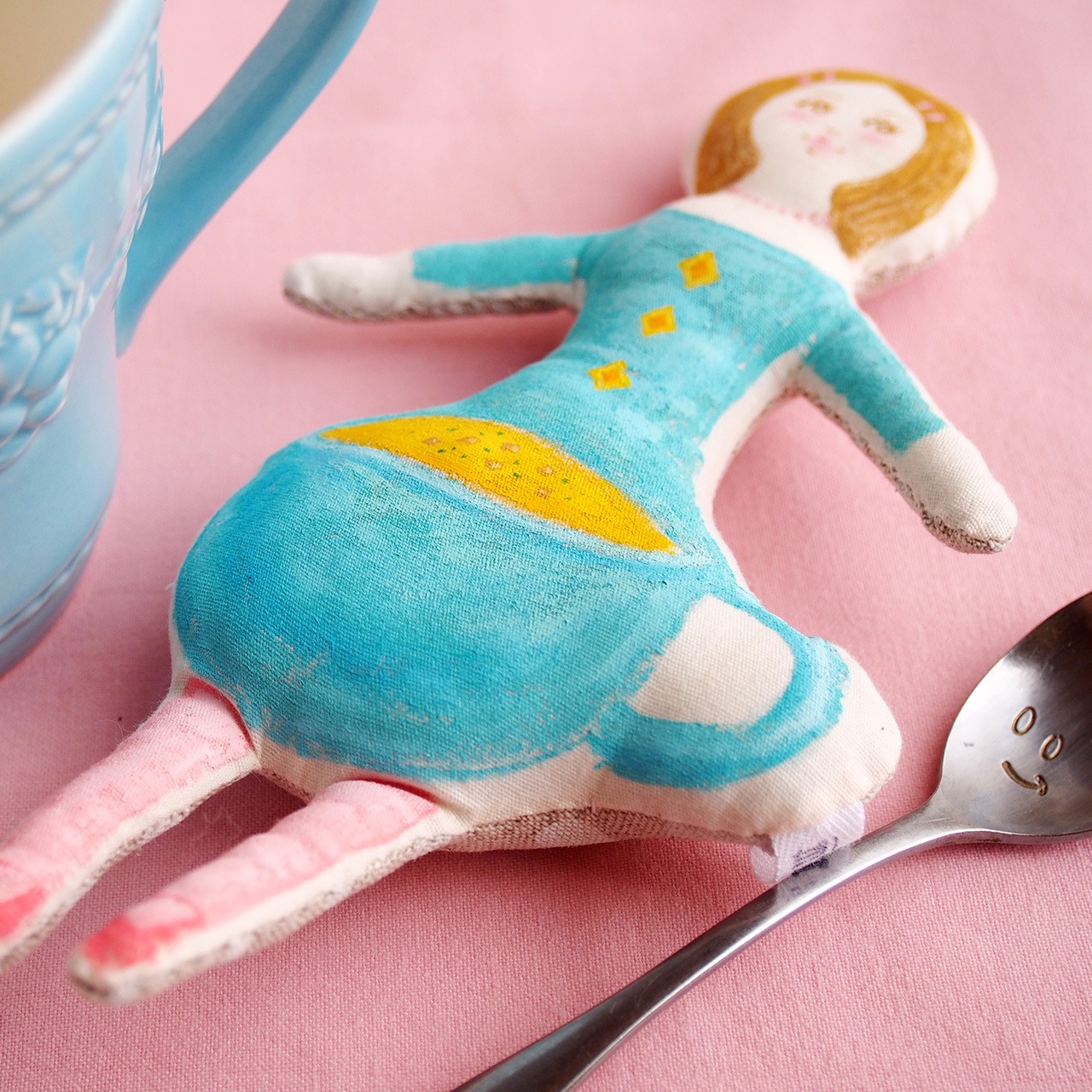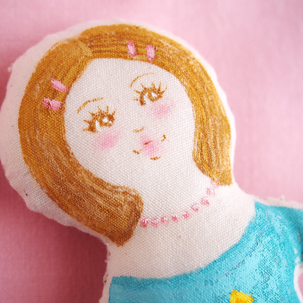 白、またはキナリの布を手縫いし、綿を入れて人形の形を作り、そこへ直接アクリル絵の具で着色しています。