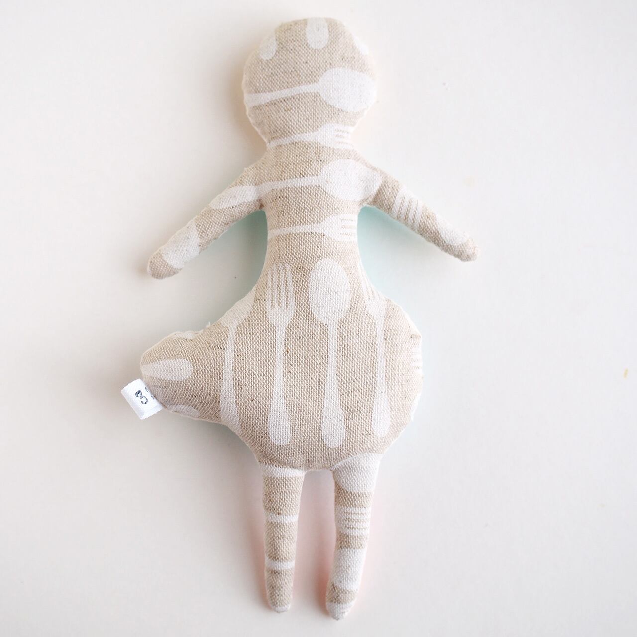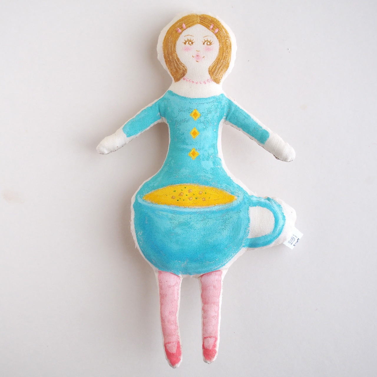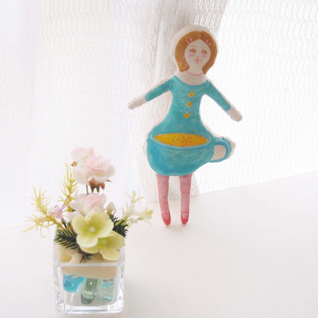 白、またはキナリの布を手縫いし、綿を入れて人形の形を作り、そこへ直接アクリル絵の具で着色しています。