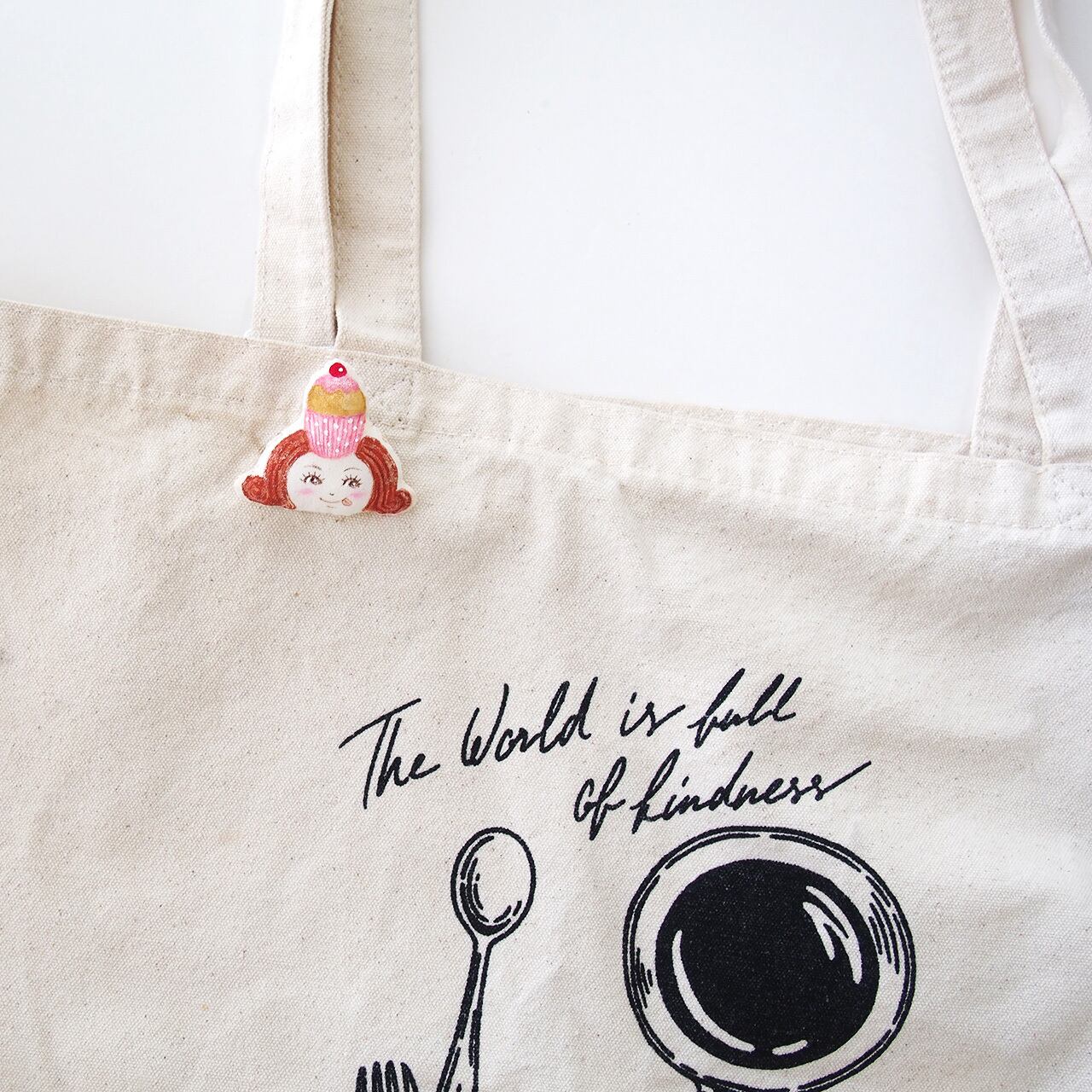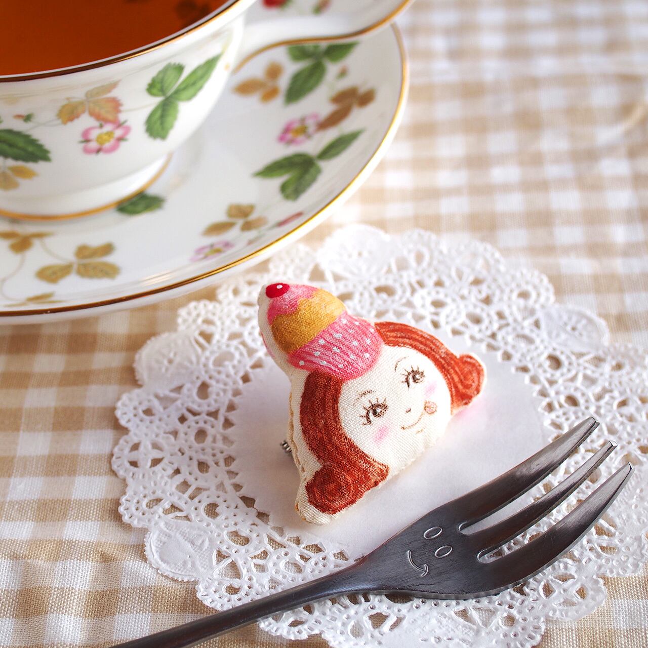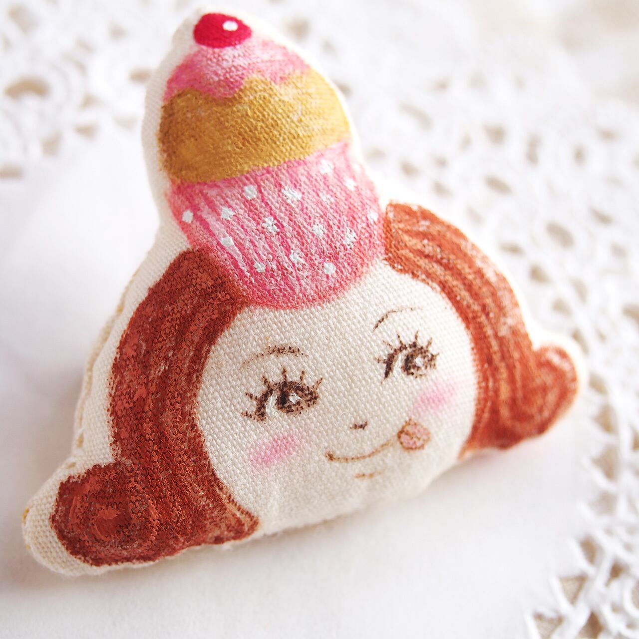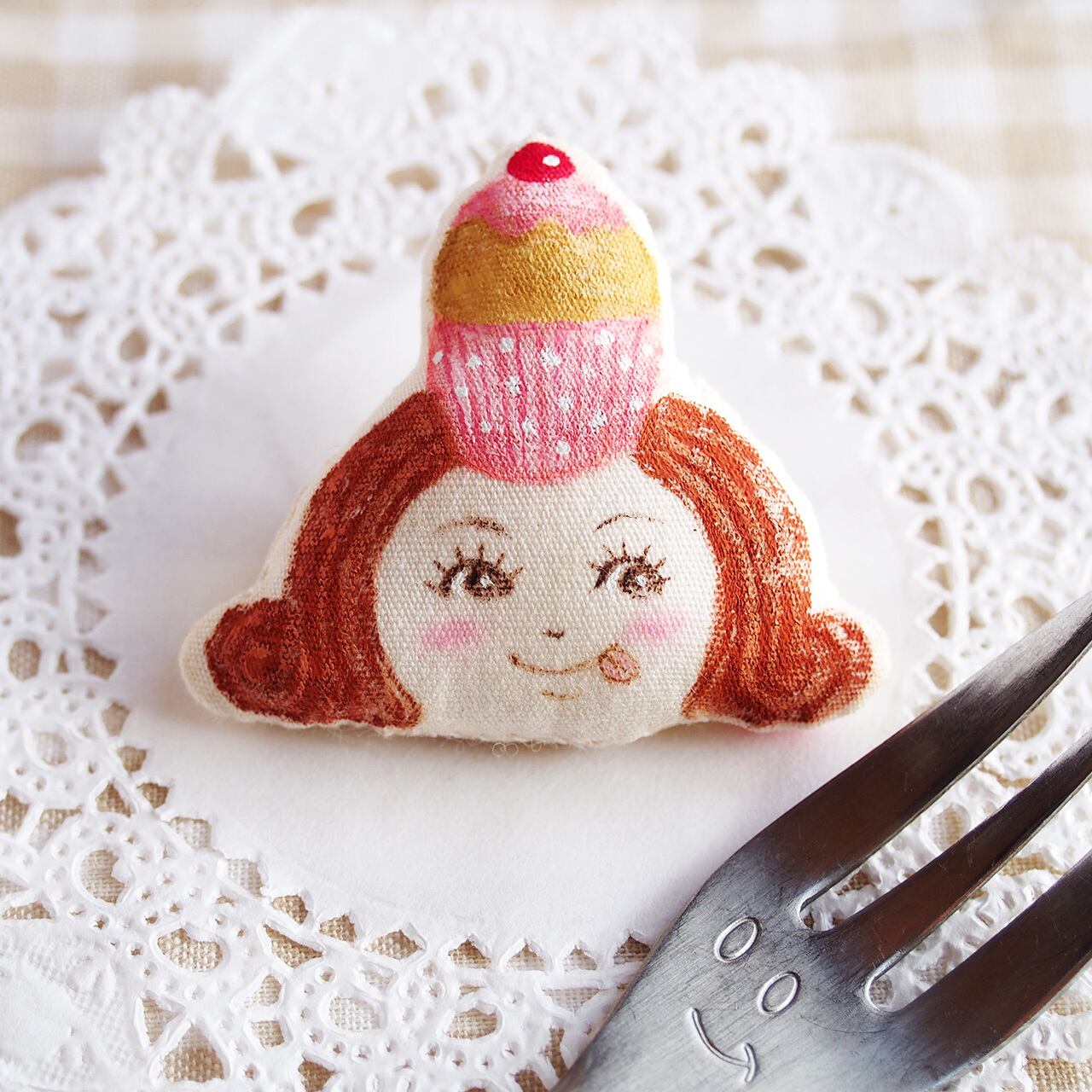 カップケーキをちょこんとかぶった女の子のお顔ブローチです。