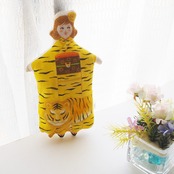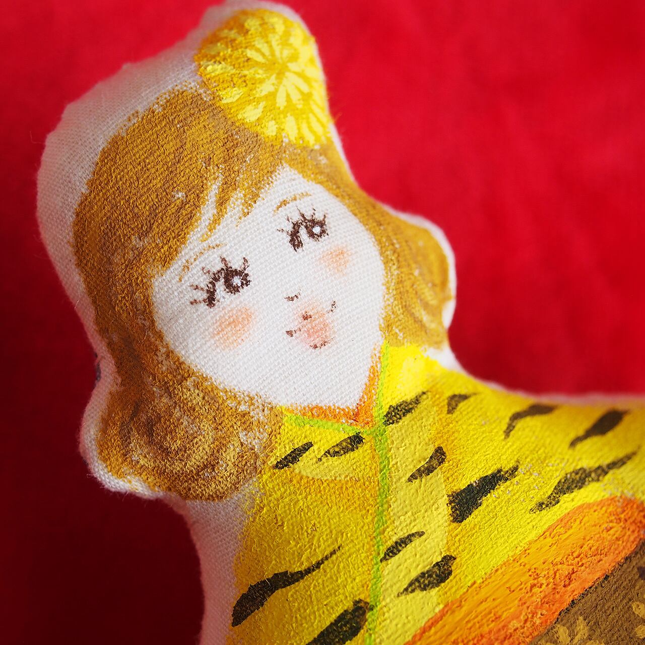 白、またはキナリの布を手縫いし、綿を入れて人形の形を作り、そこへ直接アクリル絵の具で着色しています。