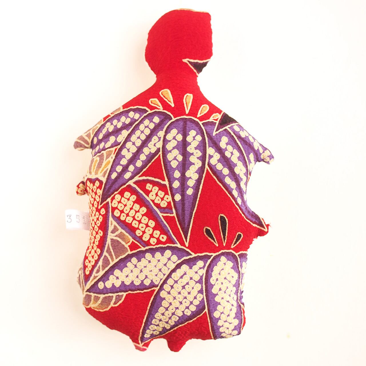 白、またはキナリの布を手縫いし、綿を入れて人形の形を作り、そこへ直接アクリル絵の具で着色しています。