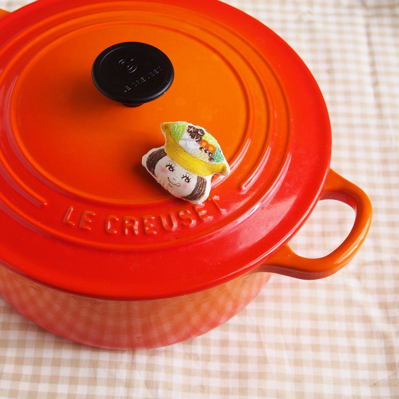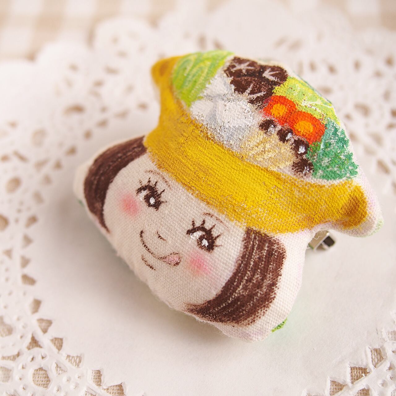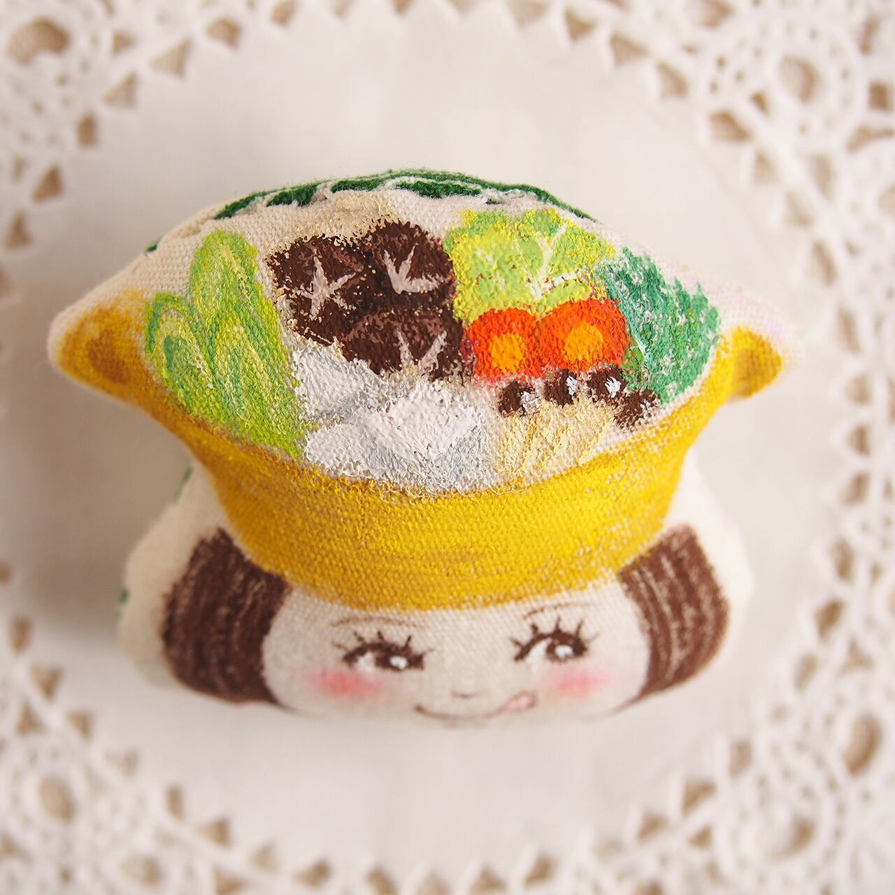 冬の定番、お野菜たっぷりお鍋の帽子をかぶった女の子のブローチです。