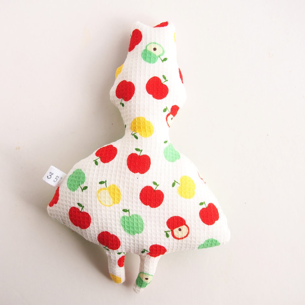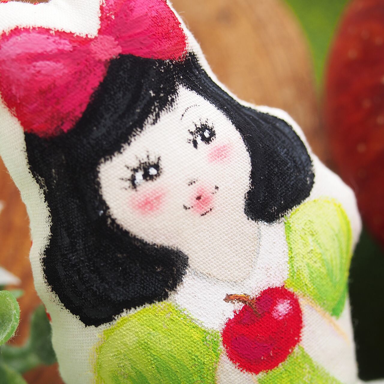 白、またはキナリの布を手縫いし、綿を入れて人形の形を作り、そこへ直接アクリル絵の具で着色しています。